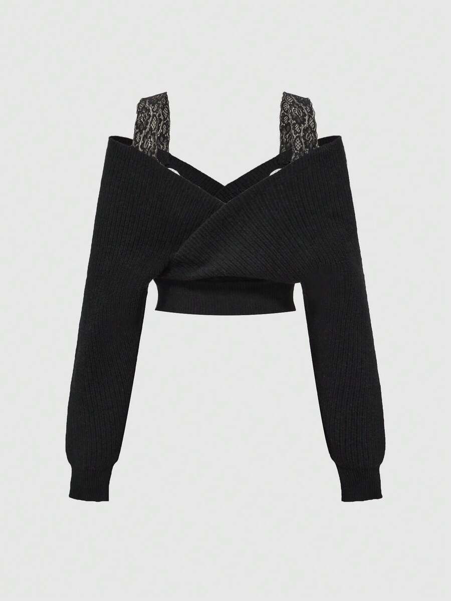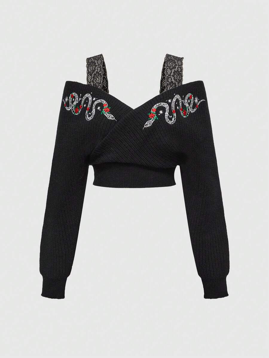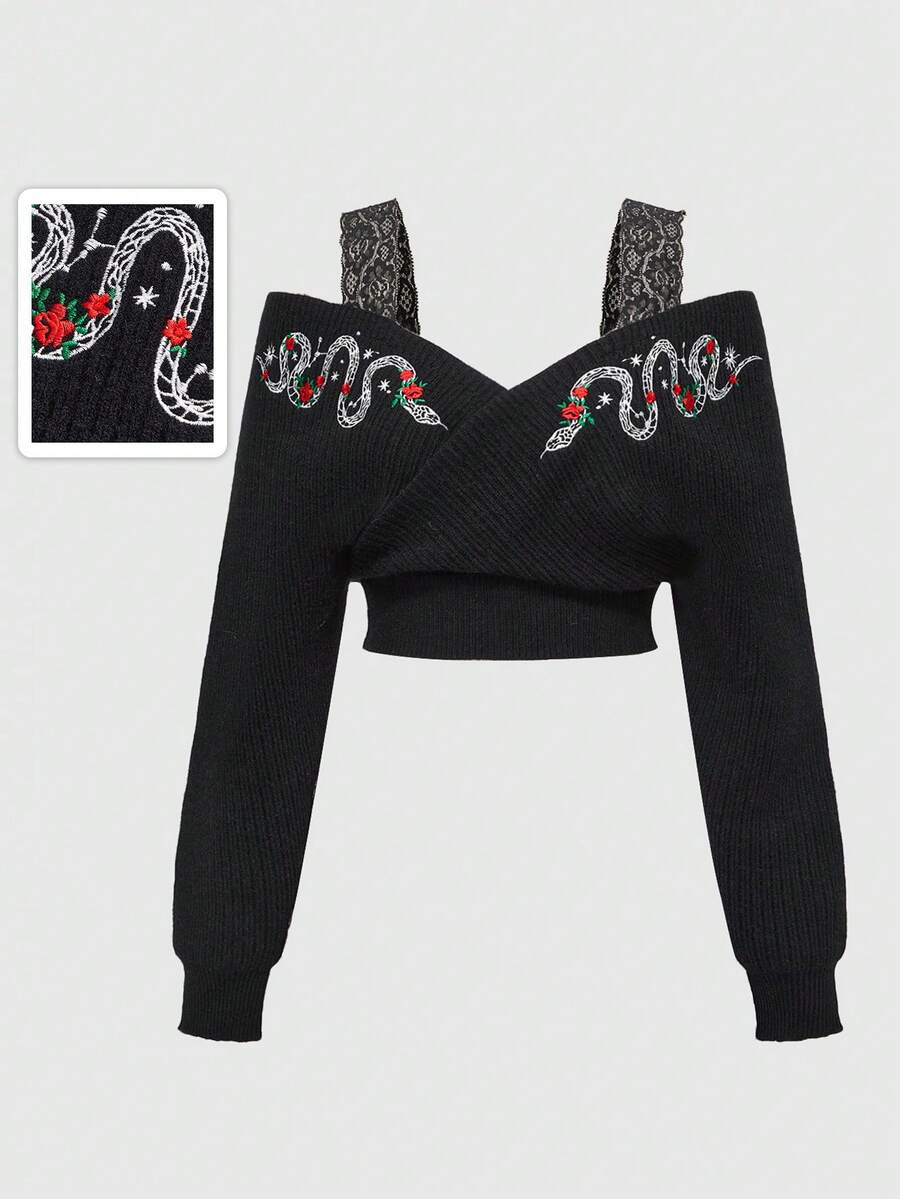 Witchy Goth Snake Embroidery Lace Strap Pullover Sweater
