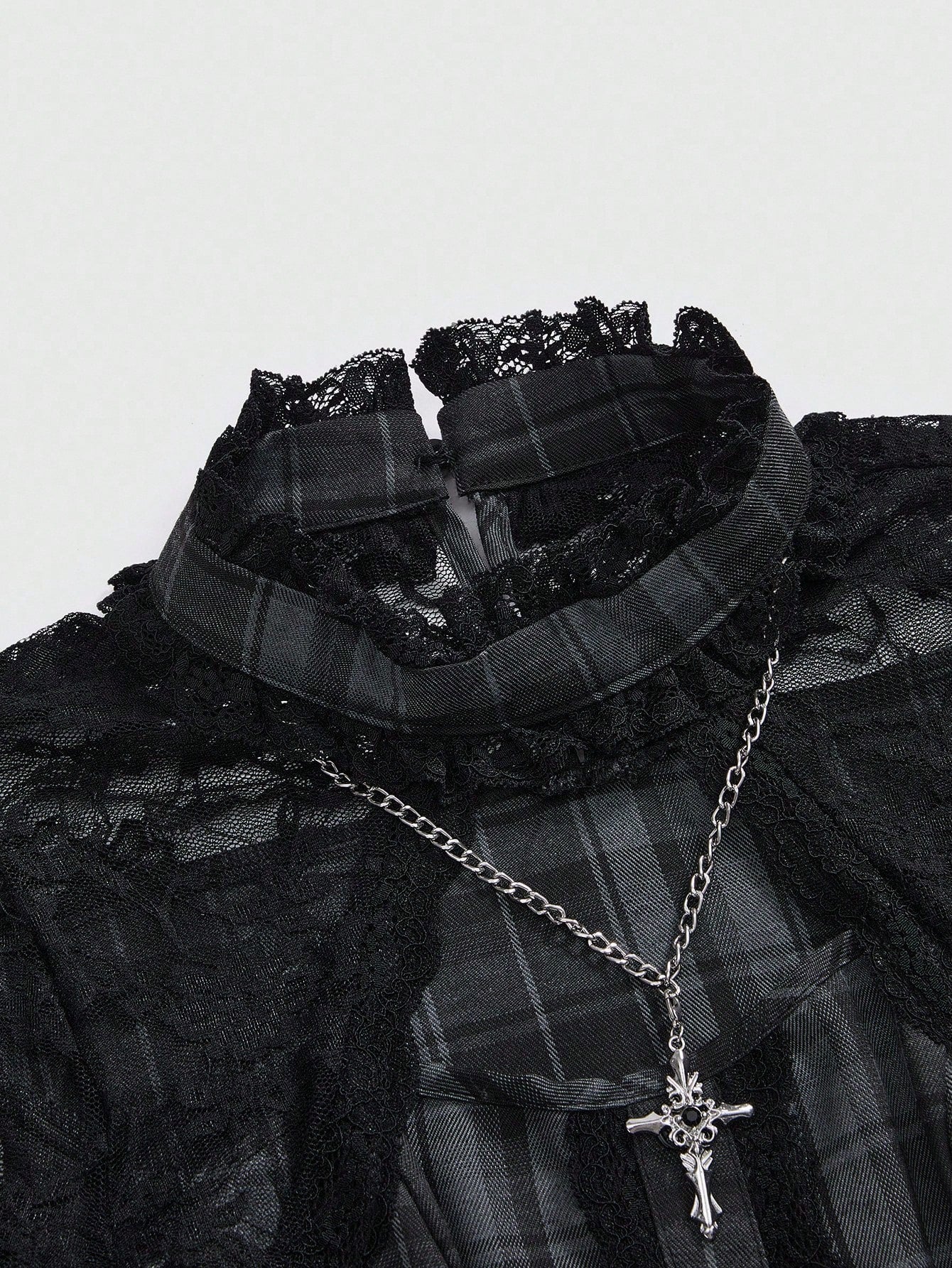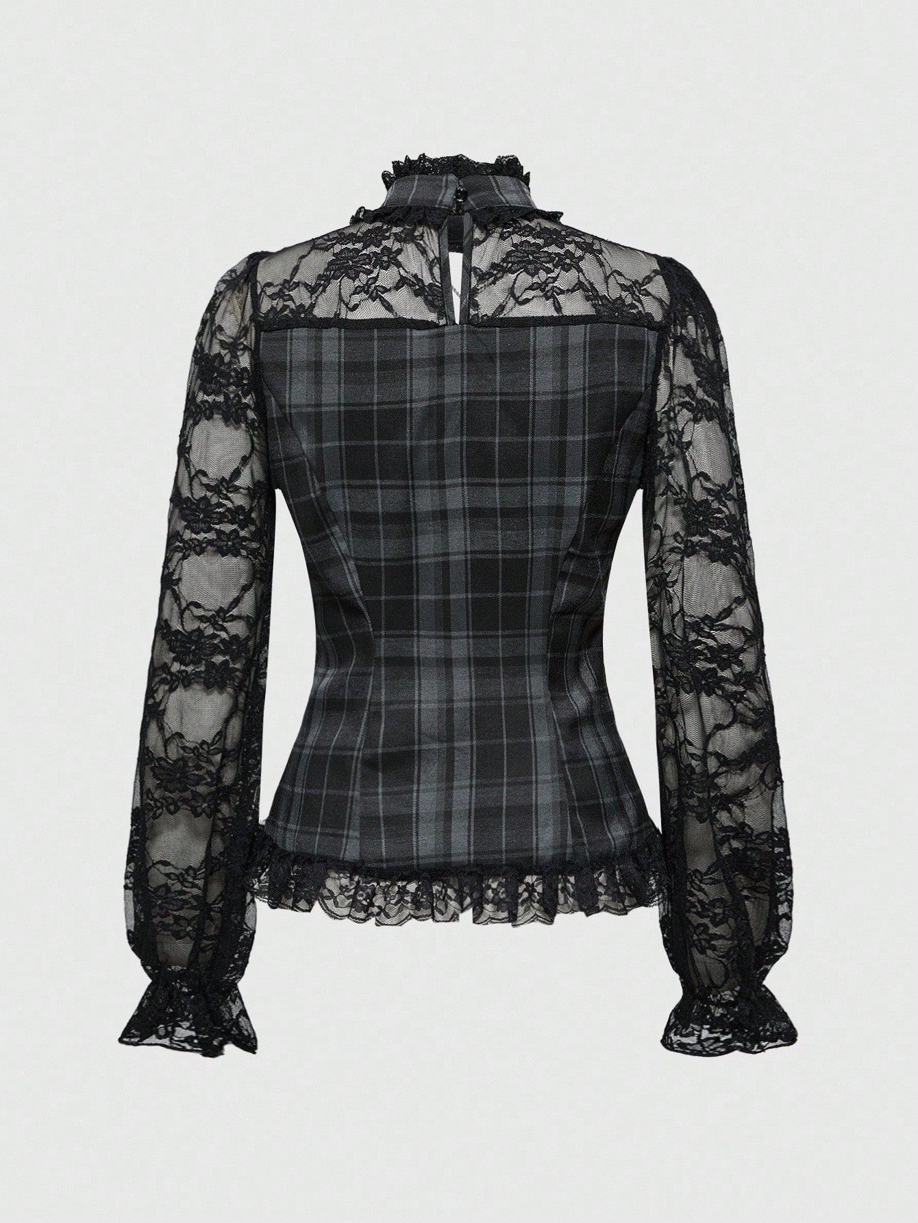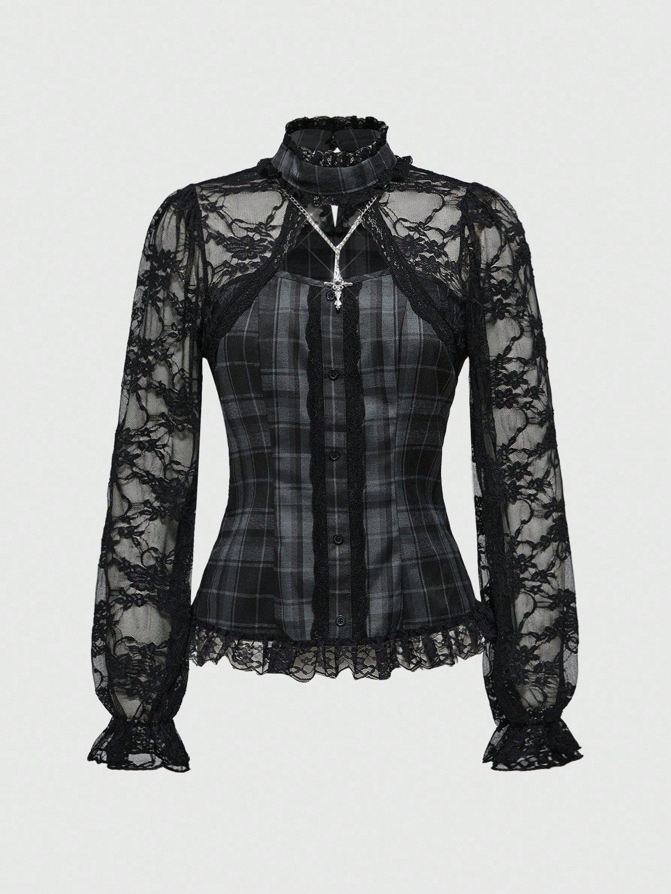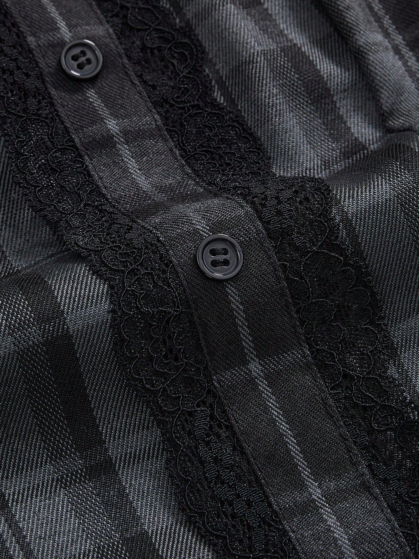 Witchy Dark Academie Contrast Lace Waist Cinched Plaid Shirt