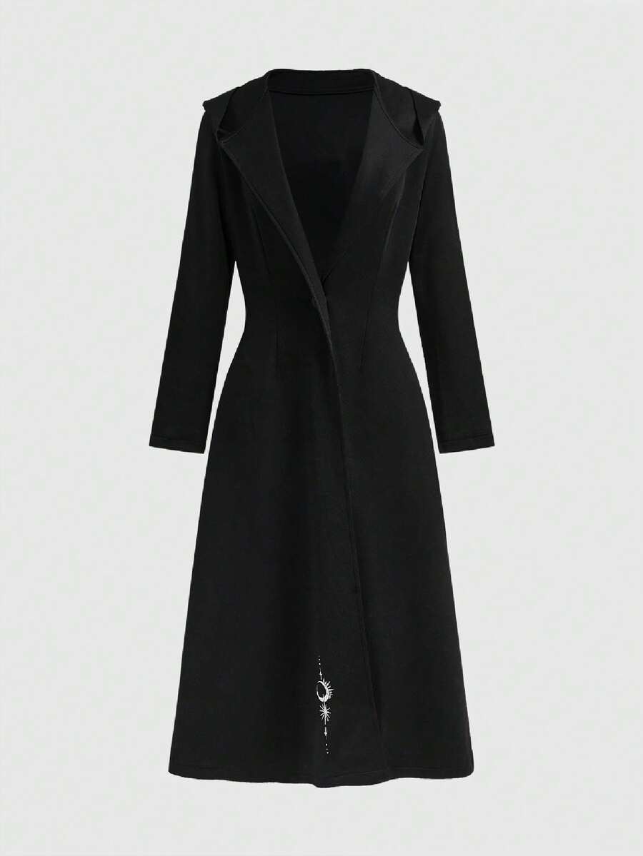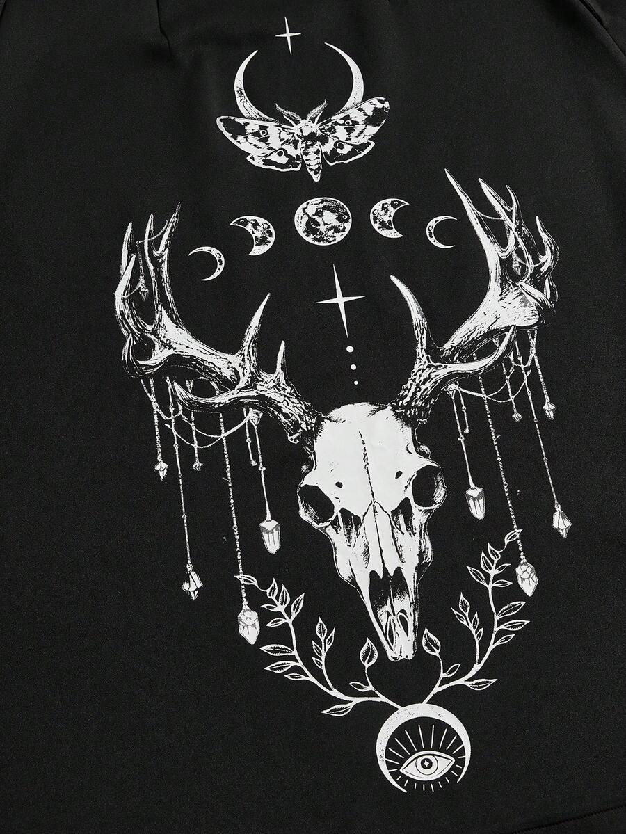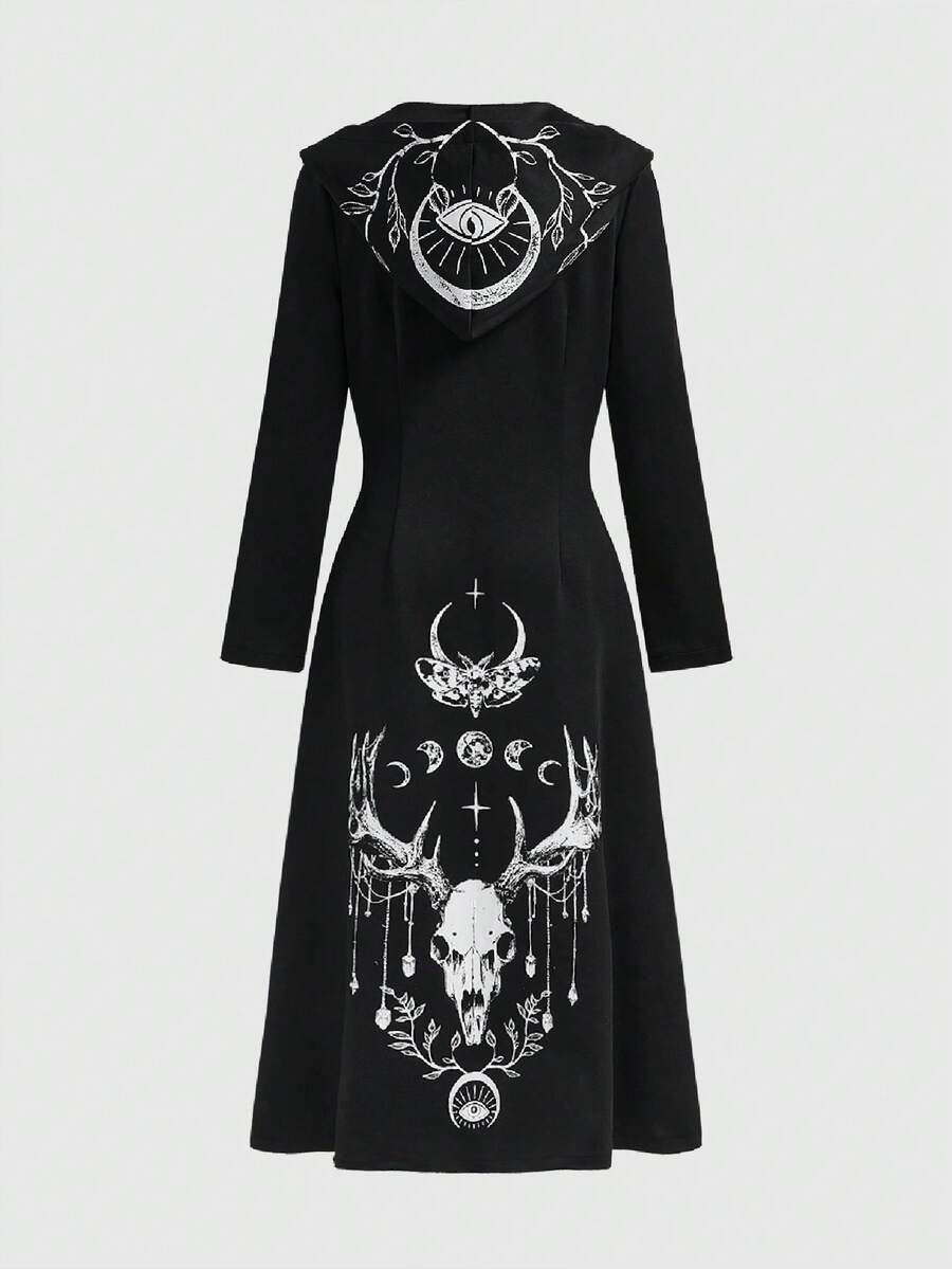 Witchy Gothic Deer Skull, Star, Moon, Moth, Leaf Eye Embroidered Long Hooded Jacket